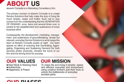Abewini Consults is a Marketing Consultancy firm. The primary concern of Abewini Consults is to create solutions (service solutions) that help make the duty of living life much simpler, easier and efficient. Consequently, the development, marketing, management, and sustenance of groundbreaking simple but relevant everyday service solutions is what keeps the team at abewini Consults awake at night.